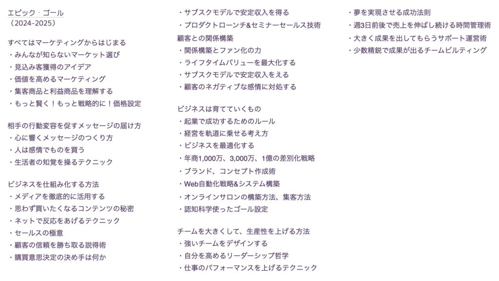 『エピック・ゴール・プログラム』は、第13期目のマスターマインド・プログラムになります。新しいマーケティング理論にくわえ、過去12期で学んだ普遍のセオリーともにまとめたマーケティングの集大成になります。