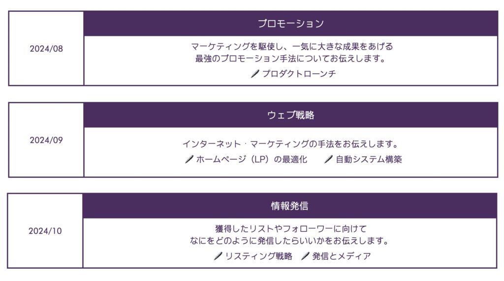 普遍のセオリーをベースにした新しいマーケティング理論を積極的に取り入れながら、過去12回の『マスターマインド・プログラム』で培った経験を、いまの市場に落とし込んだマーケティングの集大成になります。