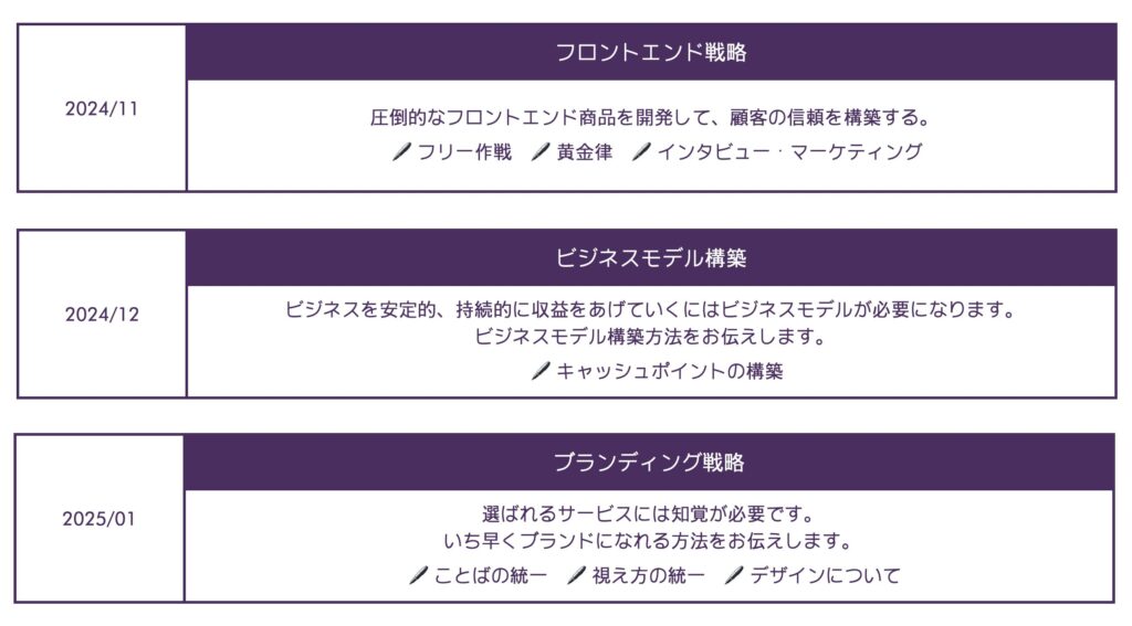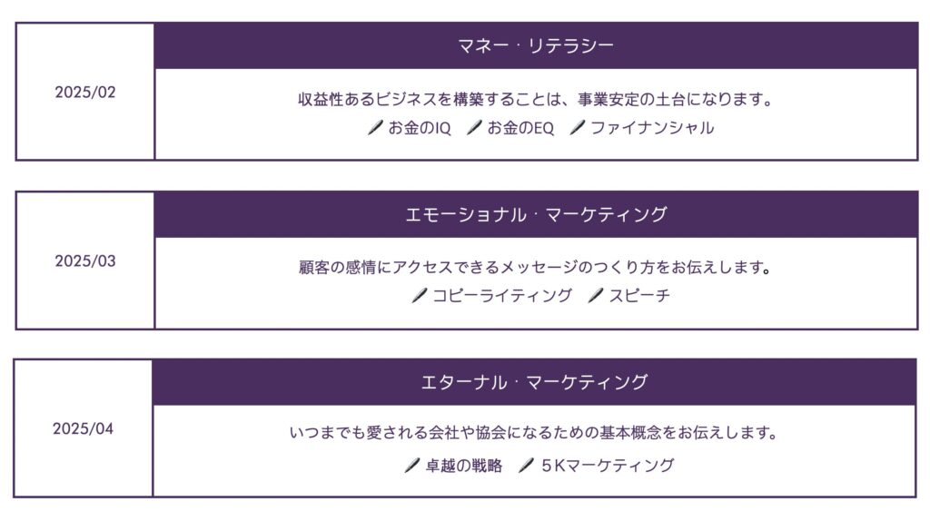 顧客が集まる仕組みづくり、収益を生み出す構造化、少数精鋭のチーム・ビルディングなど、あなたのビジネスが飛躍する年間プログラム